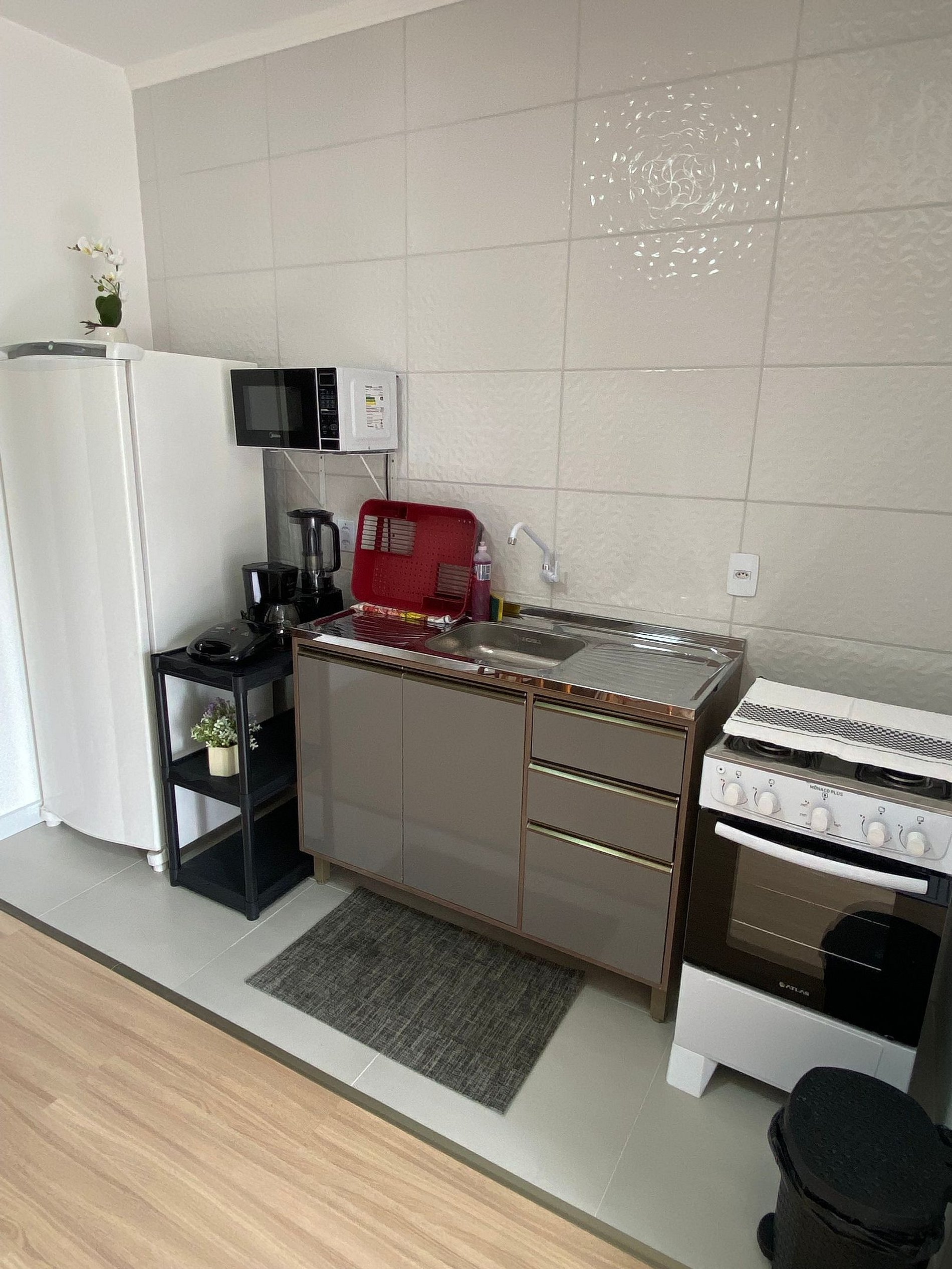 Fornecemos roupa de cama, toalhas de banho e rosto, sabonetes novos. Possui cozinha utilitária com fogão 4 bocas, microondas e geladeira. Talheres, pratos, copos, panelas, chaleira e cafeteira; estão entre os itens disponibilizados. Além disso fornecemos sal, café em pó, açúcar, azeite, etc.