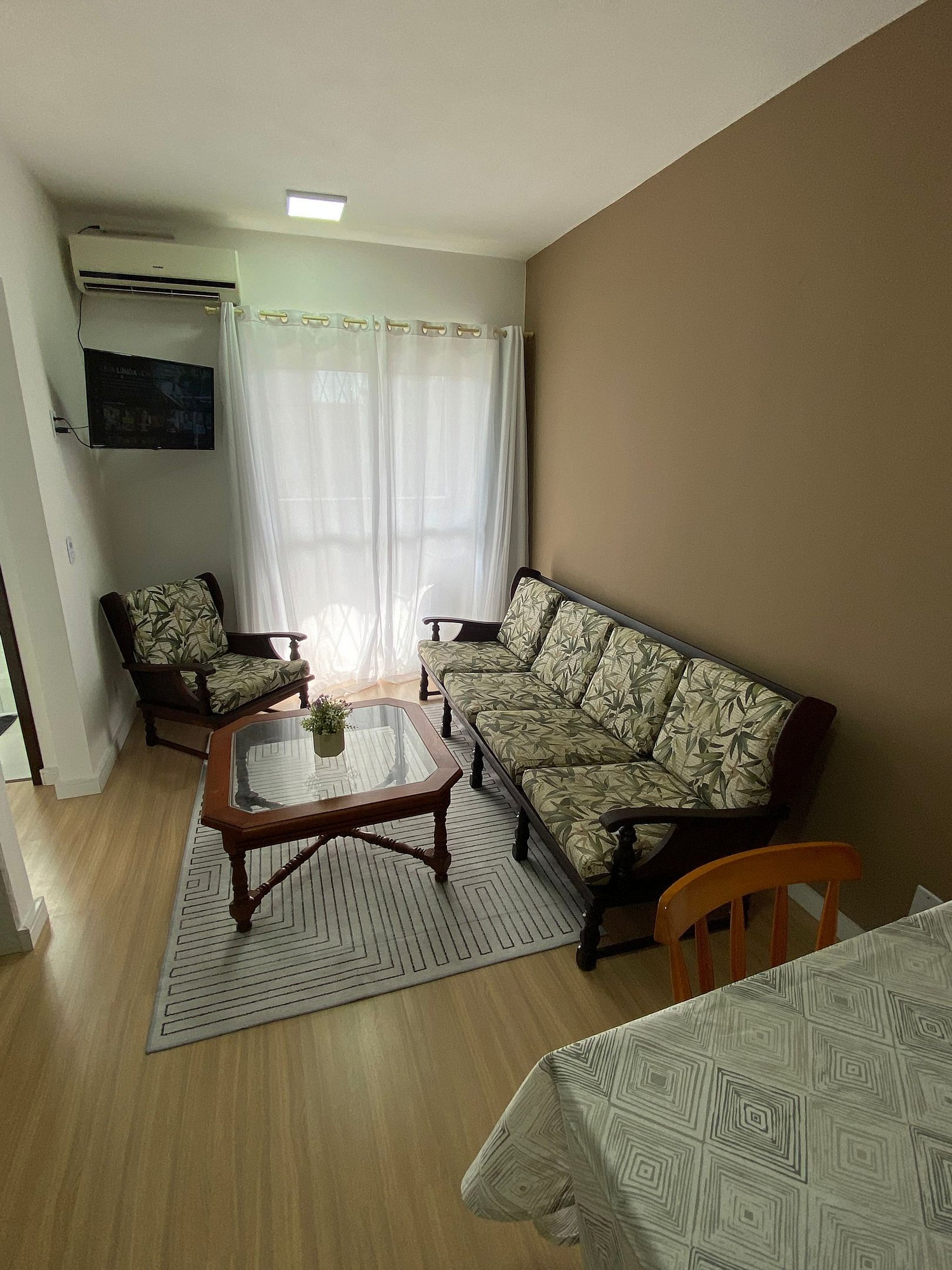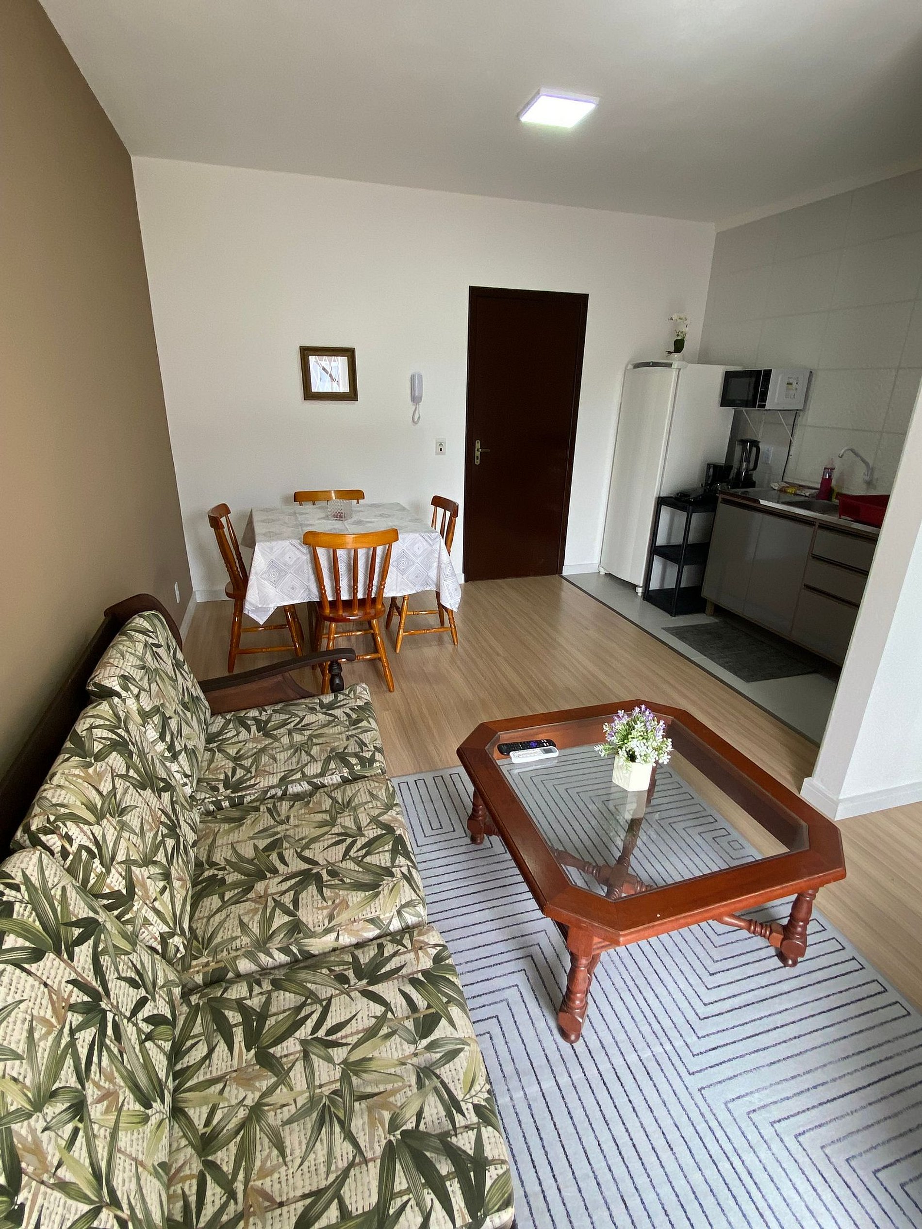 Churrasq na sacada, cozinha c forno e fogão, microondas, split na sala e quarto, geladeira, TV 32" e internet WI-FI. Fornecemos sabonete, roupa de cama e banho, e cobertor.
