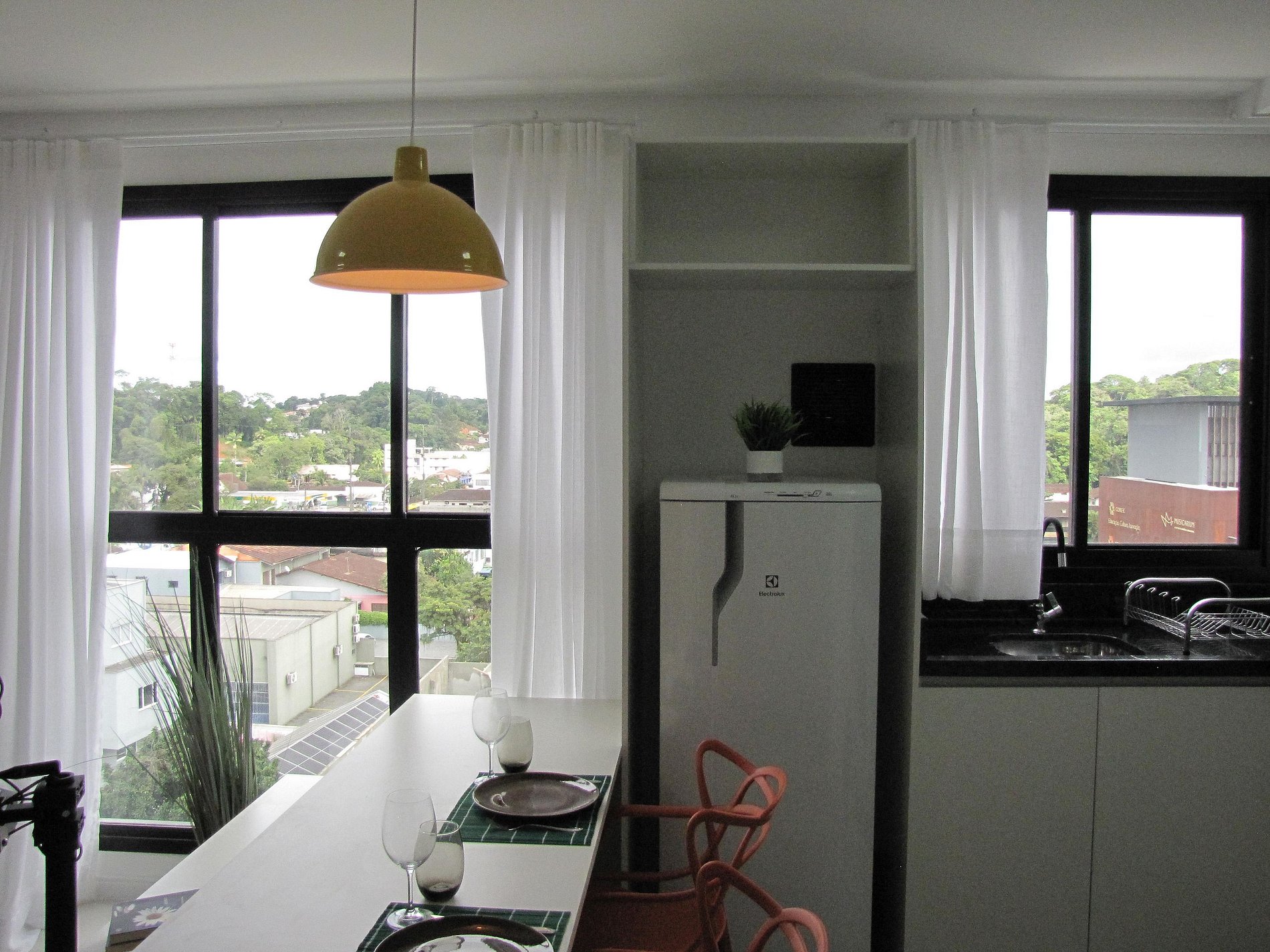 Studio fica no 4o andar com linda vista para a Serra do Mar. Móveis de utensílios refinados de alto padrão, conforme o padrão de alto luxo que o edifício apresenta. Rooftop com linda piscina e espaço para contemplação da cidade e vista da Baía da Babitonga. Espaço fitness com equipamentos de performance.