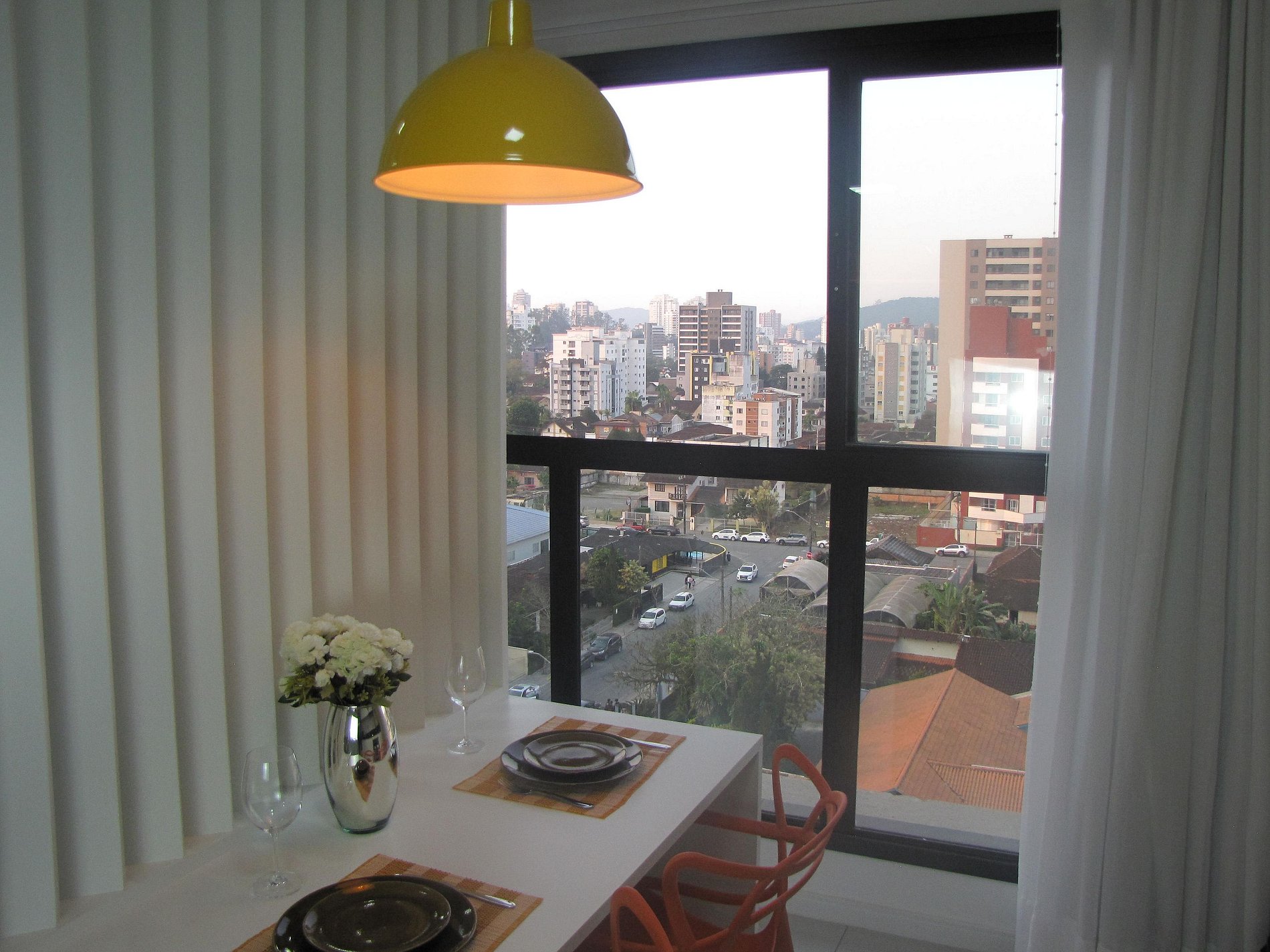 Studio fica no 6o andar com linda vista para a Serra do Mar. Móveis de utensílios refinados de alto padrão, conforme o padrão de alto luxo que o edifício apresenta. Condomínio possui lavanderia OMO paga com acesso eletrônico. Rooftop com linda piscina e espaço para contemplação da cidade e vista da Baía da Babitonga. Espaço fitness com equipamentos de performance.