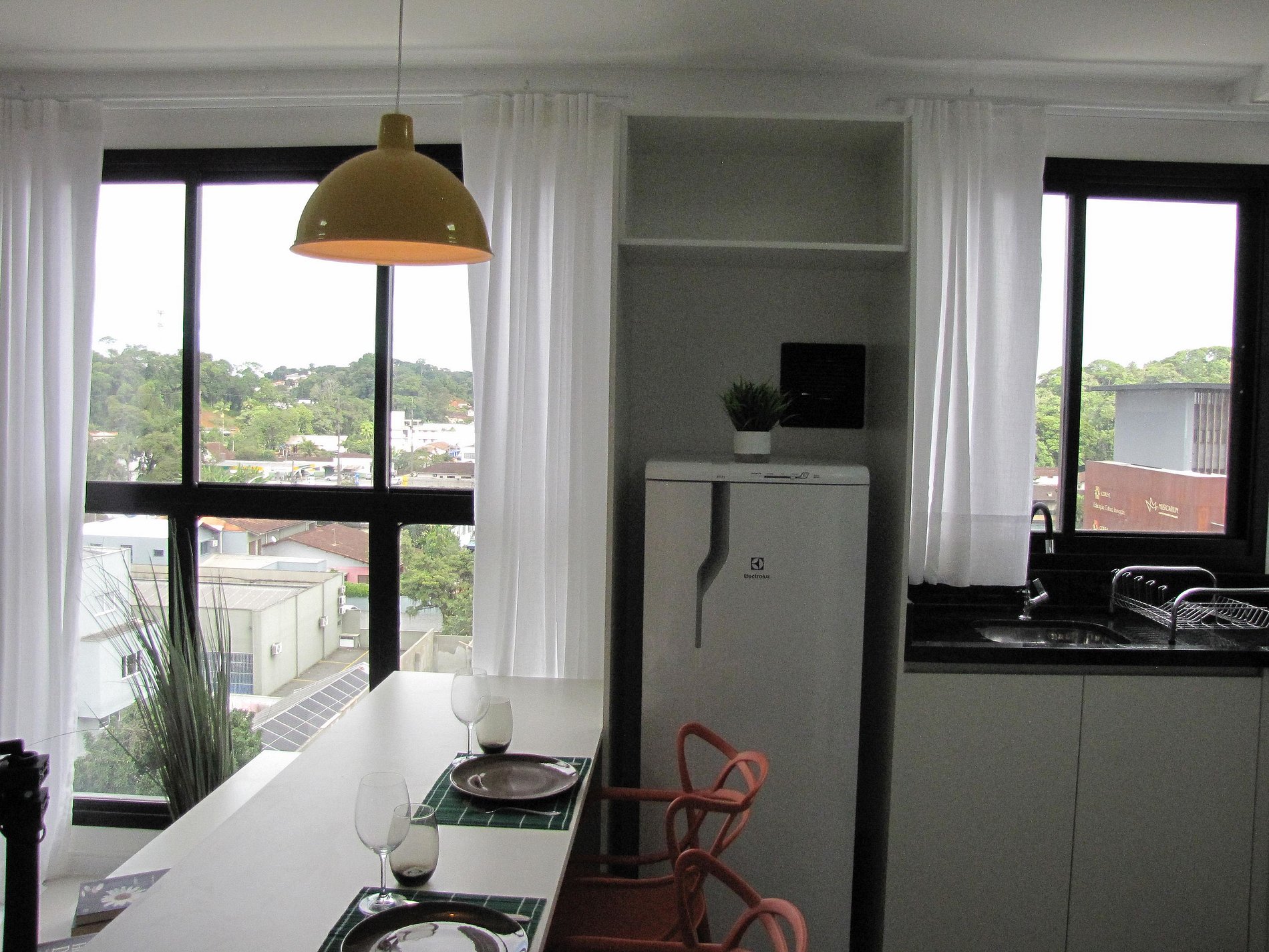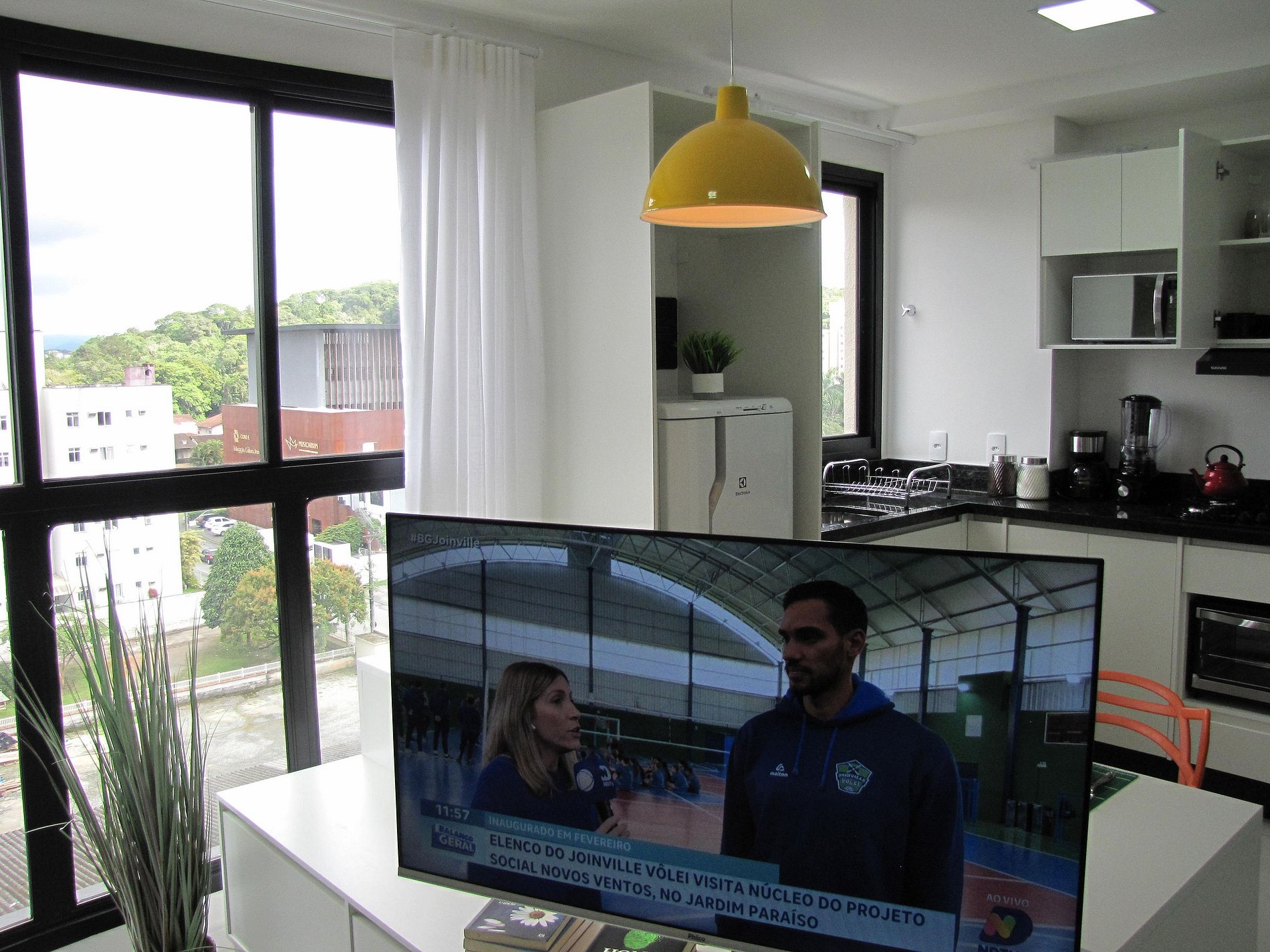 Studio fica no 4o andar com linda vista para a Serra do Mar. Móveis de utensílios refinados de alto padrão, conforme o padrão de alto luxo que o edifício apresenta. Rooftop com linda piscina e espaço para contemplação da cidade e vista da Baía da Babitonga. Espaço fitness com equipamentos de performance.