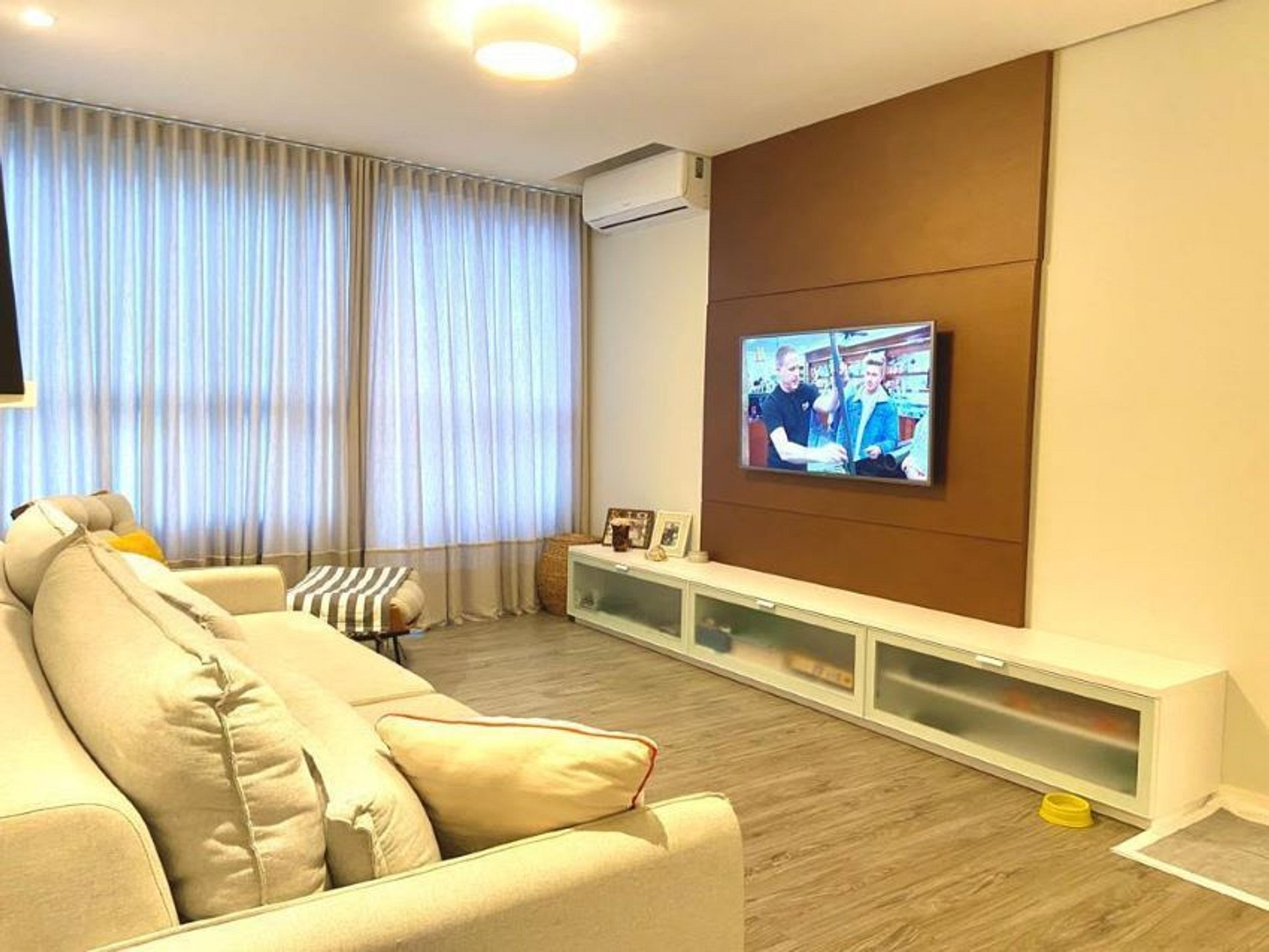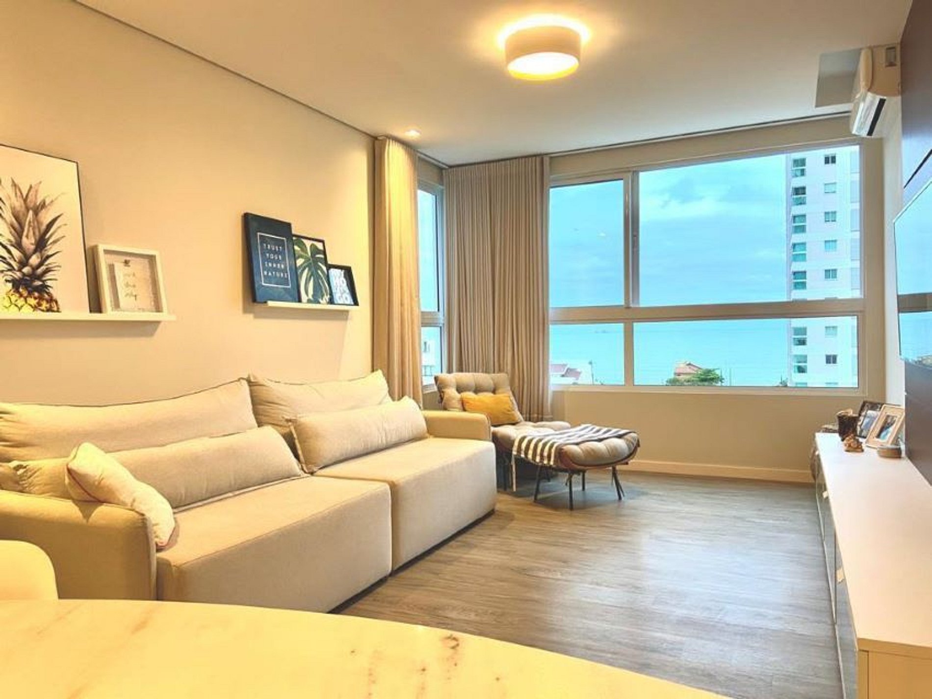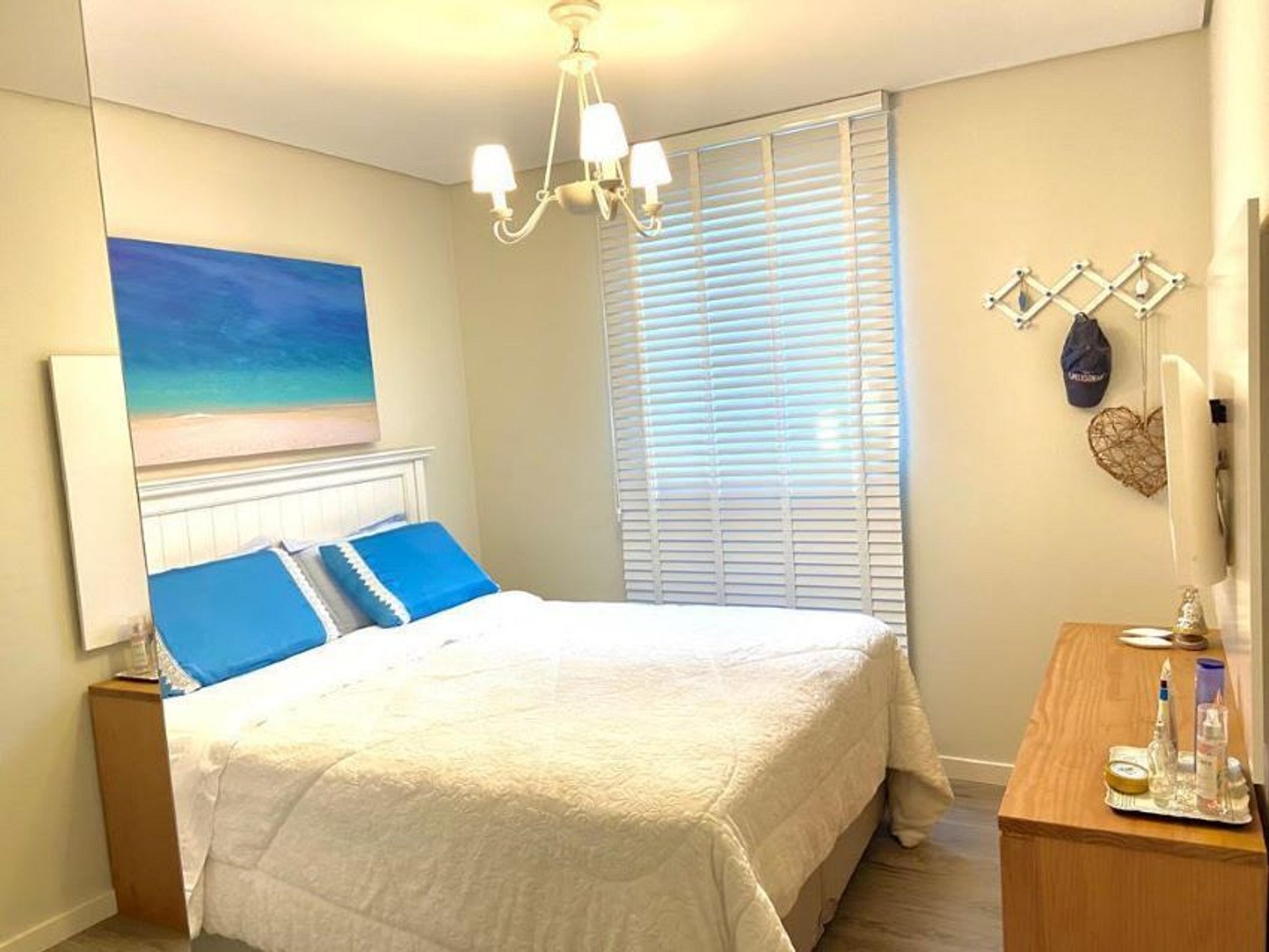 Apartamento com vista para o mar (5o andar). Dispõe de 1 suíte (cama queen) + 1 dormitório (duas camas solteiro) + um sofá cama. Dispõe de todos os principais eletro domésticos, além de filtro de água, condicionador de ar na sala e dormitórios, máquina de lavar e secar na lavanderia, secador de cabelos, smartv, etc... A vaga de garagem possui box com cadeiras (3) e guarda sol para uso dos hóspedes.