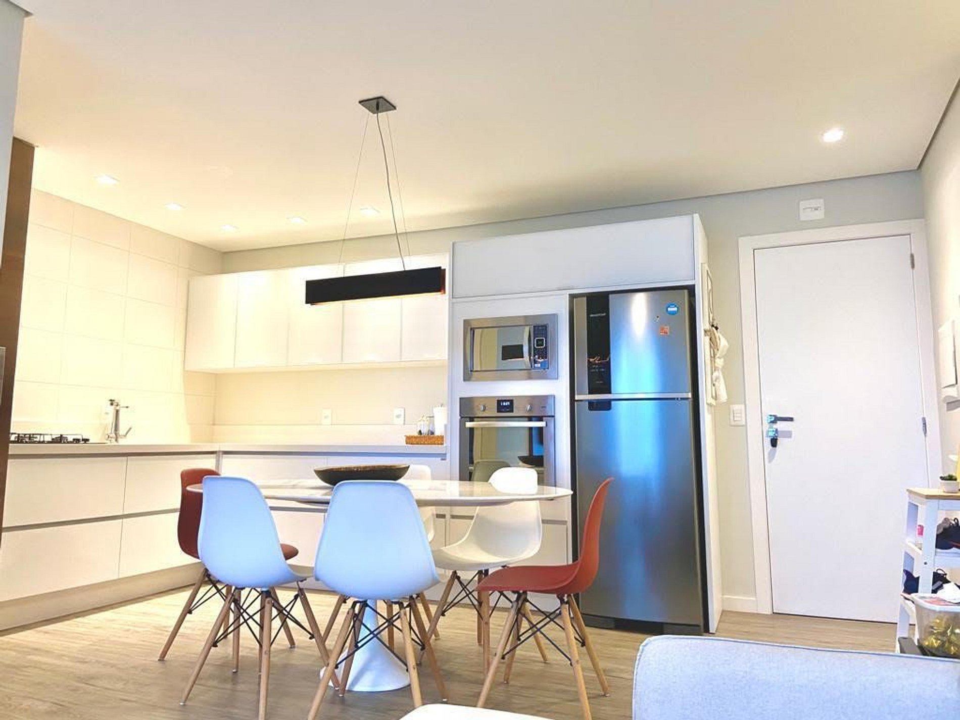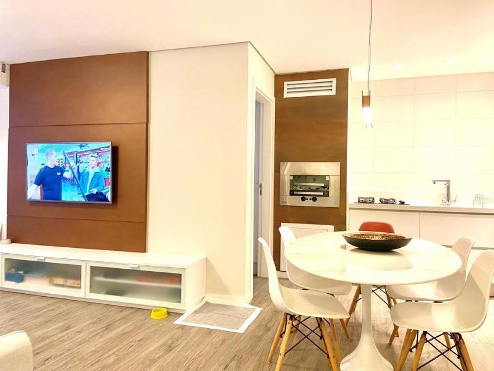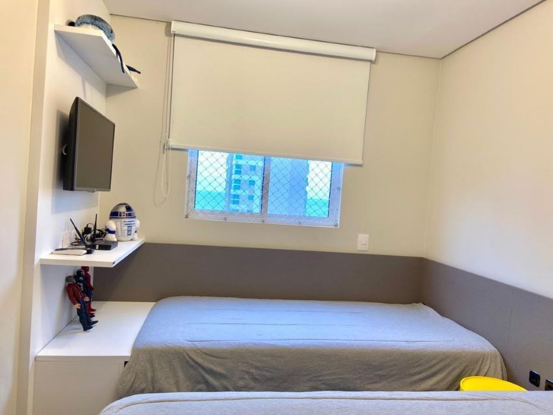 Apartamento com vista para o mar (5o andar). Dispõe de 1 suíte (cama queen) + 1 dormitório (duas camas solteiro) + um sofá cama. Dispõe de todos os principais eletro domésticos, além de filtro de água, condicionador de ar na sala e dormitórios, máquina de lavar e secar na lavanderia, secador de cabelos, smartv, etc... A vaga de garagem possui box com cadeiras (3) e guarda sol para uso dos hóspedes.